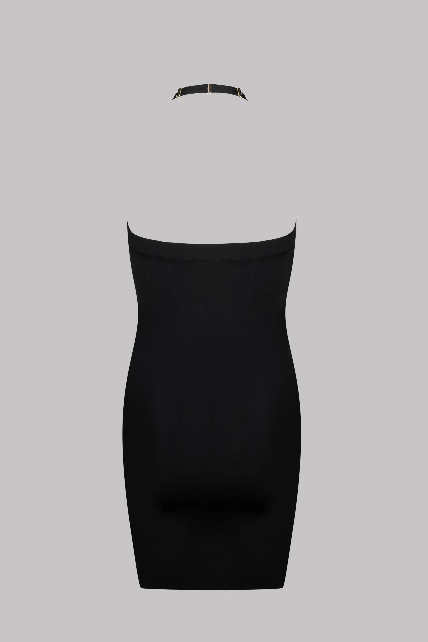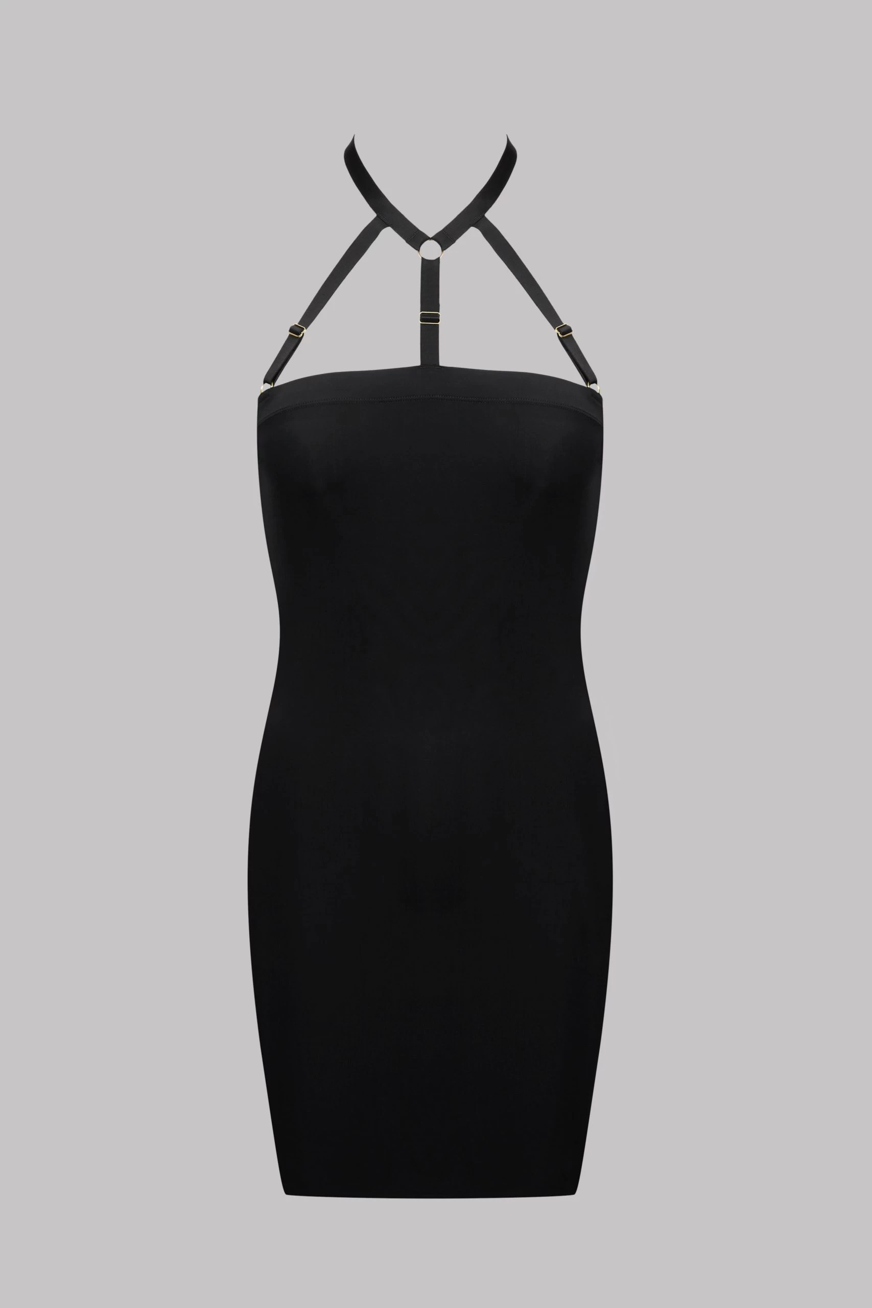 Robe bondage en microfibre opaque. Harnaché jusqu’au cou par des bandes élastiques et ajustables. Tour de cou ouvrable. Finitions thermocollées pour un effet lisse et sans couture.