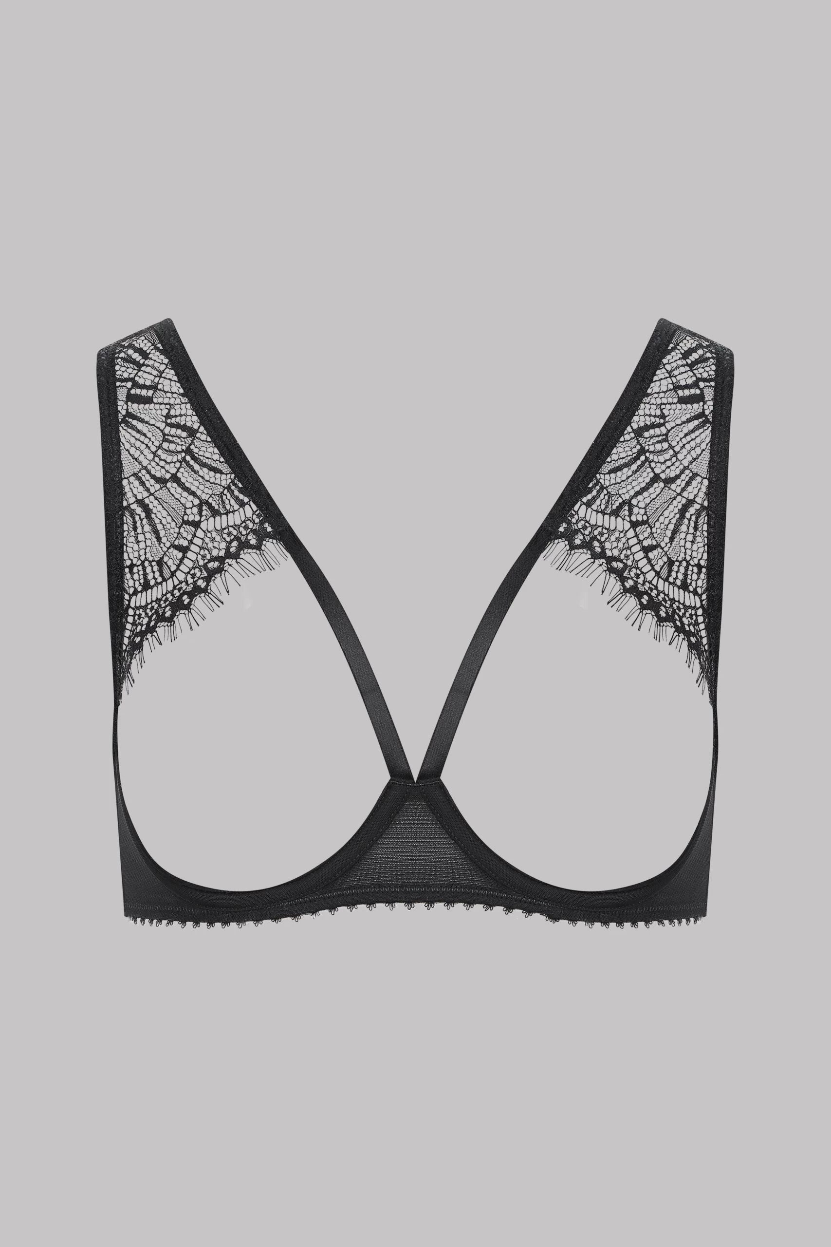 Soutien-gorge ouvert alliant une dentelle à cils et un tulle transparent bordé d’un élastique à picot. Les armatures sont recouvertes de tulle. Double bretelles élastiques et réglables, fermeture ajustable par un agrafage au dos.